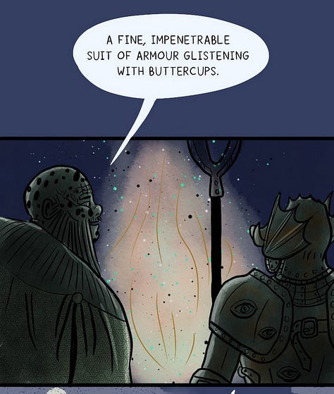 We also develop a long running *joke* that started off in episode 17, that is our princess’ Frankie’s father Augustus picturing our knight’s new human-made armour as “glistening with buttercups”. Our knight Bertie then repeats this design to the Land King in episode 78. Only now, in episode 91, amongst a field dotted with thousands of yellow flower heads, does Bertie actually learn what a buttercup is.